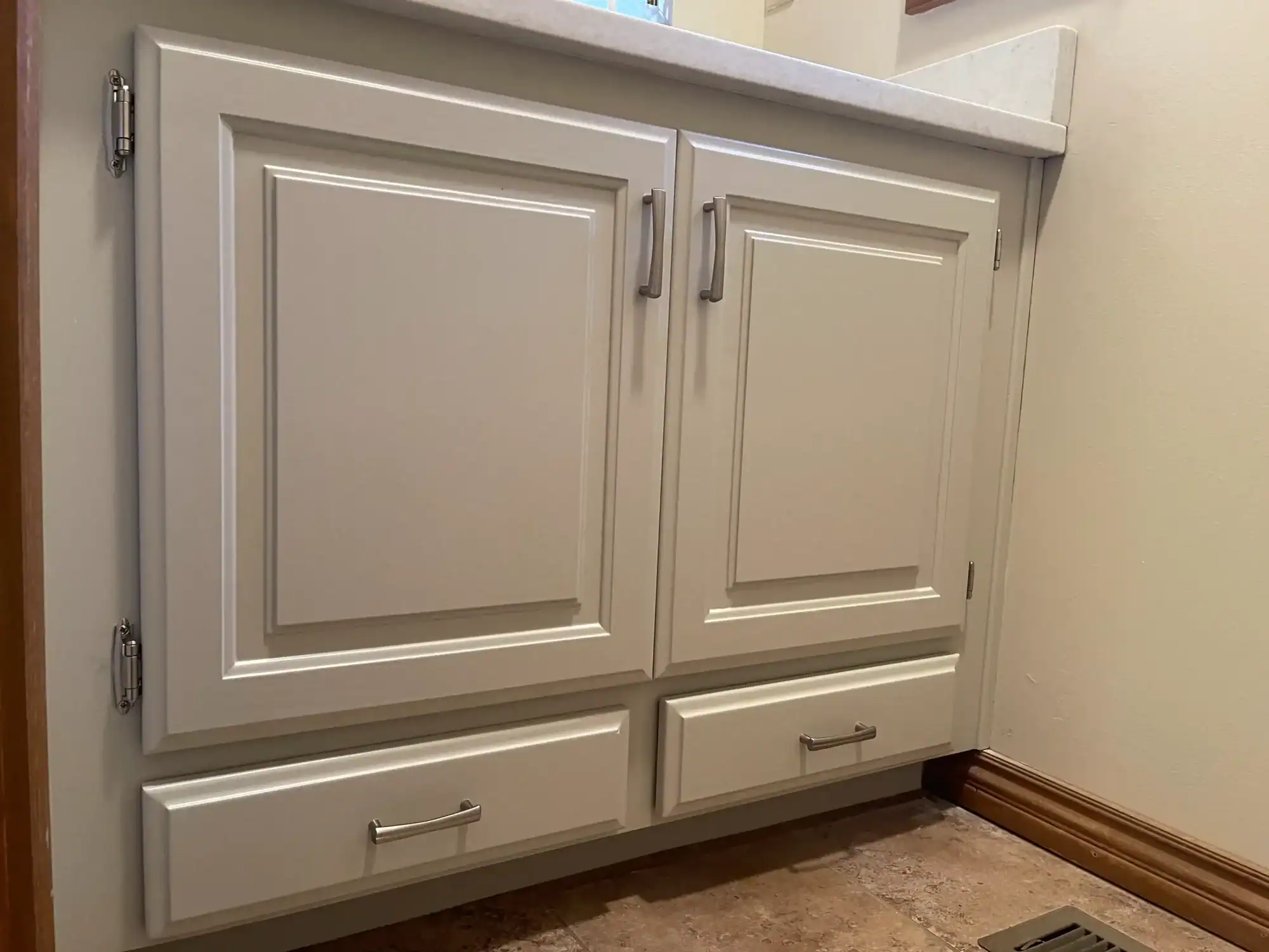 Cabinets attract dust the moment paint goes on. Kitchens, garages, and open rooms allow airborne particles, pet hair, or HVAC air movement to settle into the wet enamel. This creates grit and bumps that are impossible to buff out without repainting.
